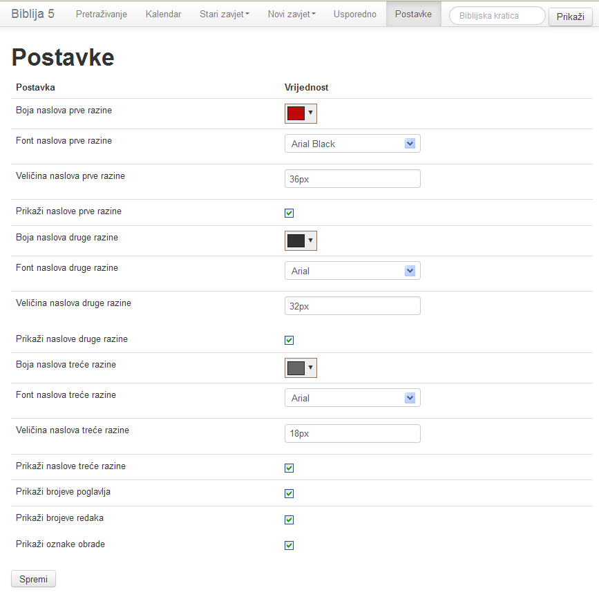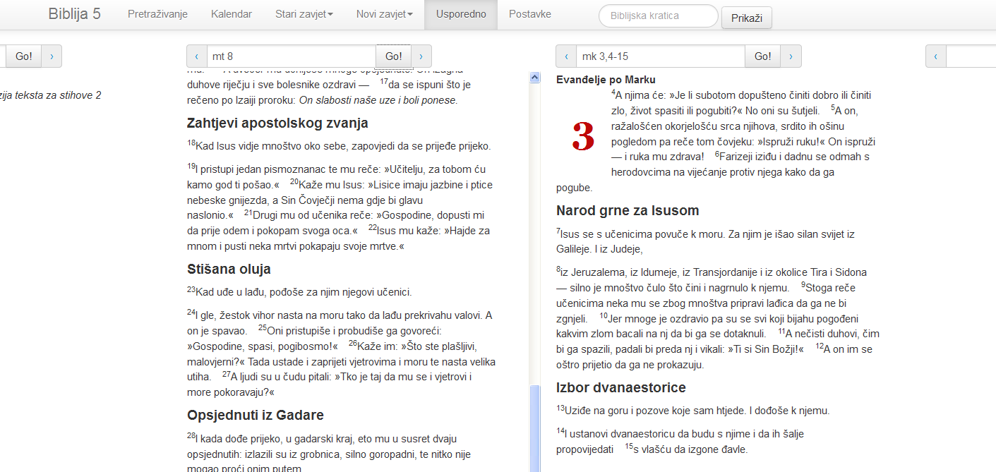Dohvaćanje biblijskog teksta preko biblijskih naslova omogućuje promatranje stabla biblijskog teksta, te pristup tekstu preko biblijskih naslova, ali ne preko biblijskih kratica. Program razlikuje tri razine naslova. Ispis cijelog stabla naslova postiže se klikom na ‘Kreni’ glavne naslovnice.