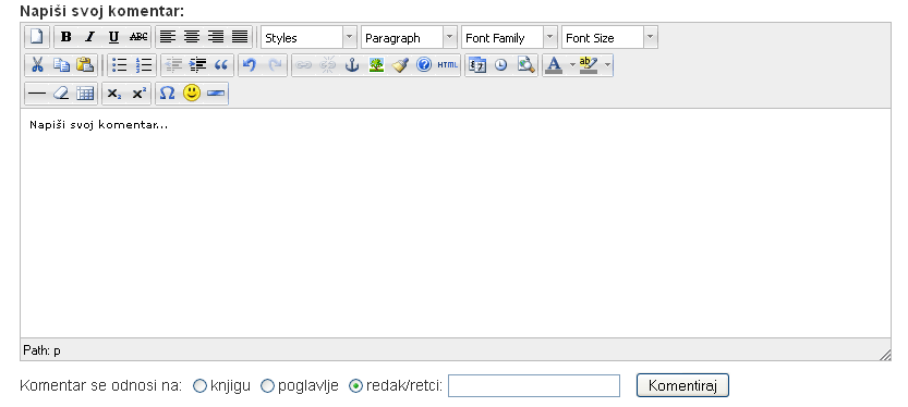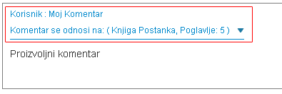 Ako korisnik komentira neko poglavlje ili redak, taj komentar se automatski odnosi i na knjigu u kojoj se to poglavlje / redak nalazi, ali mogućnost označavanja da se komentar odnosi na knjigu omogućuje korisniku da izričito komentira cijelu knjigu, tj. da dade i svoje mišljenje o knjizi.