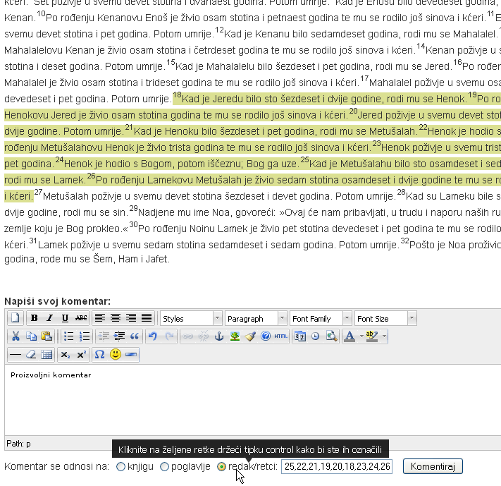 Redak se može označiti tako da se ručno unese indeks retka iz teksta ili da se selektira klikom miša željeni redak koji se želi komentirati.