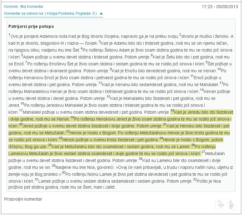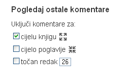 Ako se označi cijela knjiga, prikazivat će se komentari koji se odnose na knjigu, poglavlje ili točan redak/retke. Ako se označi cijelo poglavlje, prikazivat će se komentari koji se odnose na poglavlje ili točan redak/retke.