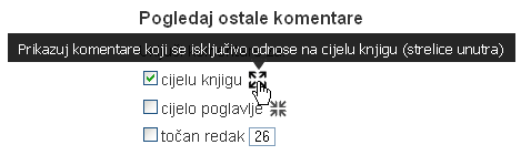 Ako se žele izdvojiti komentari koji se odnose isključivo na cijelu knjigu, onda treba označiti opciju (strelice) desno od opcije “cijela knjiga”. Ako su strelice okrenute prema unutra, onda se prikazuju komentari koji se odnose isključivo na cijelu knjigu.