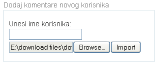 Korisnik sam naziva ime korisnika (komentara) koje uvozi, zatim odabire file koji je izvezen (export) prethodno objašnjenim postupkom.