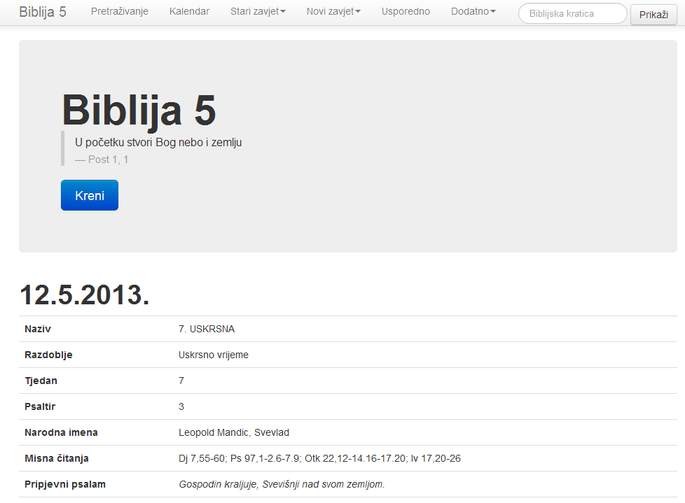 Na početnom zaslonu ispisuje se trenutačni datum i prikazuju misna čitanja i časoslov za taj dan. Informacija uključuje sve relevantne liturgijske značajke tog dana (razdoblje, psaltir, pripjevni psalam, svetačka i minsa čitanja i sl.)