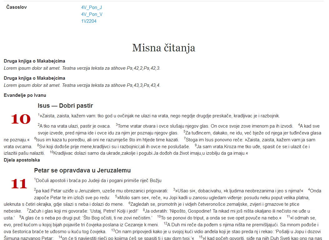 Ispisuju se misna čitanja i link na svetačka, ako se tog dana slavi neki svetac ili svetica. Časoslov takodjer ima posebne linkove na jutarnju i večernju molitvu ili svetačku tog dana